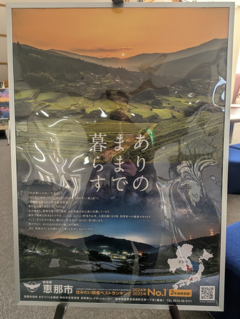 串原振興事務所にある看板、見ると2024年・2025年と2年連続で恵那市は住みたい田舎ランキングNo.1だそうです😳