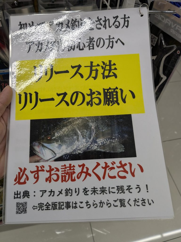 やはりと言うかなんというか、アカメコーナーはほんの一角のみで店内のメインとなる商品はシーバスやバス😊アカメ釣りに対するルールが掲示されていました😊