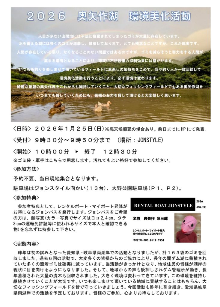 2026年1月25日(日)に奥矢作湖環境美化活動を行います🌊